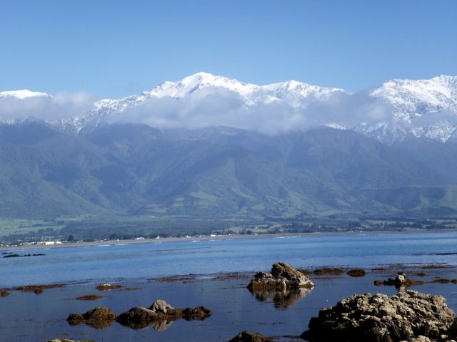 In Kaikoura for 2 nights at a motel, feeding and handling sheep at a sheep shearing demo, a rainy day activity. With the motel on the beachfront and mountains in the background, it was hard to decide which of the many pictures to use. Lunch preparation at the motel was done before starting on a hike around the peninsula. At the start of the hike, one must get around the gatekeeper. After that, the hikers walk along some impressive limestone formations past more guardians and along rocky beaches suitable for beachcombing, to South Bay on the far side of the peninsula. Looking back at South Bay as we walked back overland into Kaikoura.