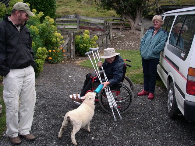 Getting ready for a hike. This time Suzanne split off from the rest at the first swing bridge and spent much of her time in the valley instead of climbing the hill. She ate her lunch with the sheep, while Rod had a different visitor at his bench up on the mountain. The kia wasn't much interested in Rod's staff, but Jane's pack was irresistable. Lamb. Two hikers. Mossy trees. Stream. Hikers along stream. Rod. Swing bridge. Hikers.
