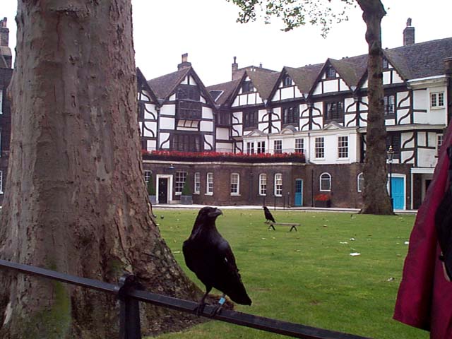 The ravens at the Tower of London are encouraged, and quite accustomed to crowds. The Queen's House in the background.